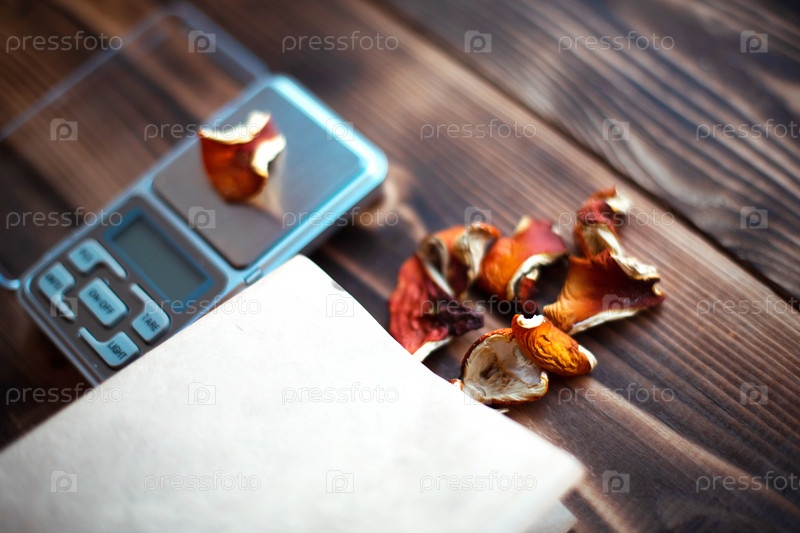 Сушеные кусочки грибного мухомора на столе с чешуей. Измерение микродозы, микрограмма психоделического, терапевтического наркотического вещества в ядовитом мухоморе. Микродозирование, психотропное