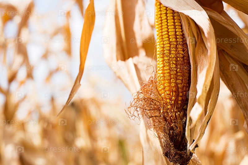 Крупный план спелой желтой кукурузы на фоне сухого высохшего поля. Зерновые, сельское хозяйство, праздник осеннего урожая, День благодарения. Место для текста