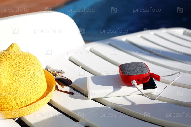 Музыкальная портативная колонна заряжается от энергобанка через USB на сиденье возле бассейна с пляжными принадлежностями. Всегда в контакте, гаджеты для путешествий, внешний аккумулятор для смартфона. Место для текста. флейта