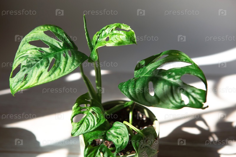 Monstera obliqua Monkey Mask макролист на подоконнике под ярким солнечным светом с тенями. комнатные растения в горшках, зеленый домашний декор, уход и выращивание