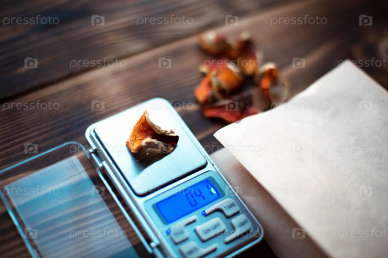 Сушеные кусочки мухомора на столе с чешуей. Измерение микродозы, микрограмма психоделического, терапевтического наркотического вещества в ядовитом мухоморе. Микродозирование, психотропное
