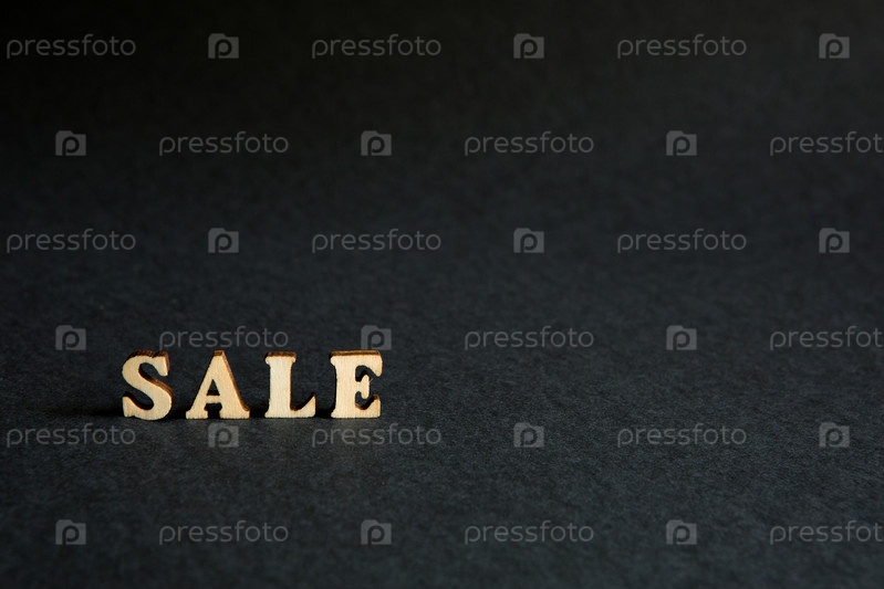 Надпись «Продажа» из деревянных букв на черном фоне. Черная пятница, скидки, распродажа, покупки, знак интереса. Место для текста