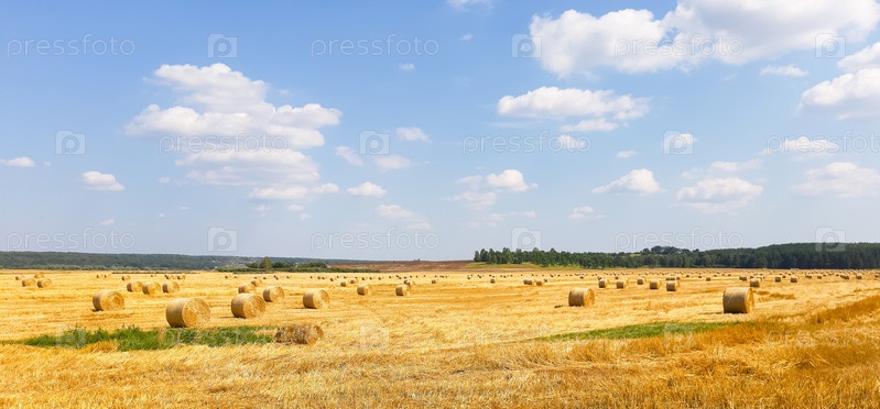 Круглые золотые стоки в поле. Урожай зерна, пшеницы. Заготовка сена для скота, сельского хозяйства, зерновых культур