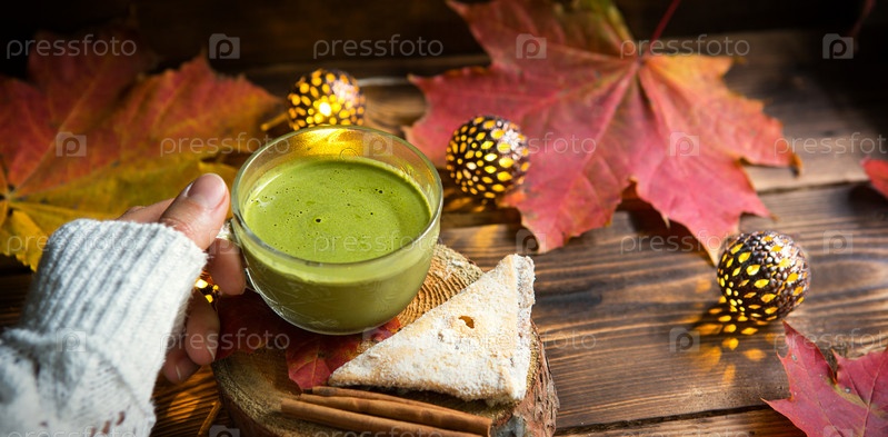 Зеленый японский чай маття с пеной в прозрачной чашке на деревянном столе в осеннем натюрморте. Женская рука с длинными рукавами белого свитера согрета напитком. Сосредоточьтесь на чашке. Теплая атмосфера и уют