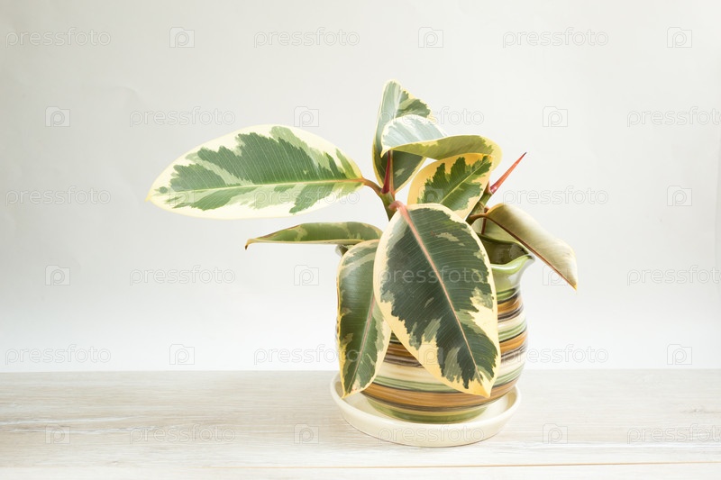Крупный план листьев фикуса каучукового пестрого с распускающейся почкой с новым молодым листом. Уход за домашними растениями, выращивание, полив и удобрение. Абиджан, сорт эластика, Белиз