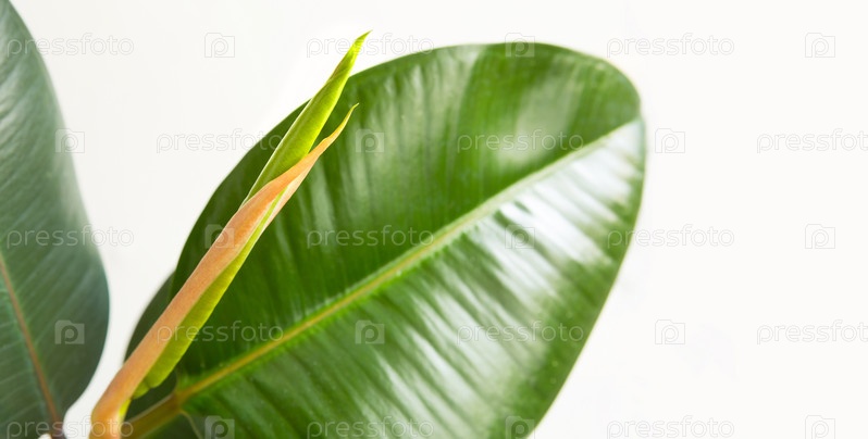 Каучуконосный лист фикуса крупным планом с бутоном, открывающимся новым молодым листом. Уход за домашними растениями, выращивание, полив и удобрение