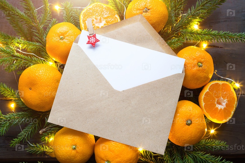 Конверт с листом бумаги - письмо от Деда Мороза, Copyspace на рождественском фоне из мандаринов, гирлянды, веток пихты. Шприц-звезда для записей. Новый год, список пожеланий, мечты, подарки