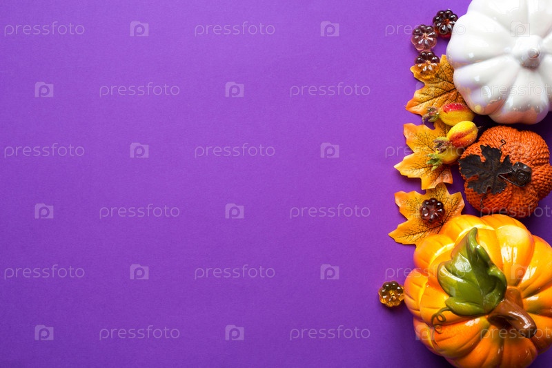 Рамка из тыквы, желтые кленовые листья, ягоды на фиолетовом фоне. Осенний урожай, настроение. Копировать пространство, плоскость