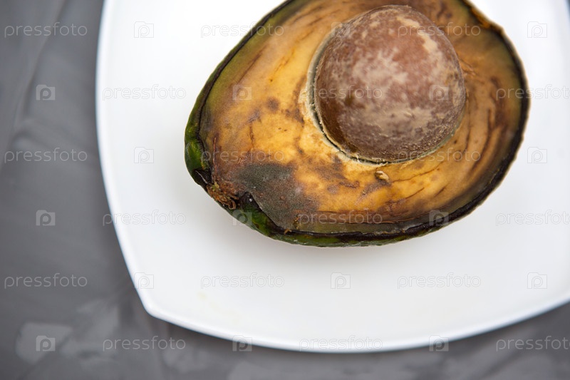 Испорченный авокадо с зеленой плесенью и черными пятнами гнили и грибка на сером фоне. Разрежьте натуральный фрукт напополам с круглой косточкой. Место для текста