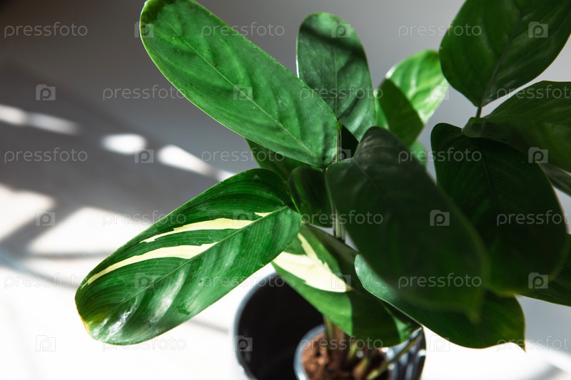 Сорт Ctenanthe marantifolia Golden Mosaic - крупный план листьев на подоконнике при ярком солнечном свете с тенями. комнатные растения в горшках, зеленый домашний декор, уход и выращивание