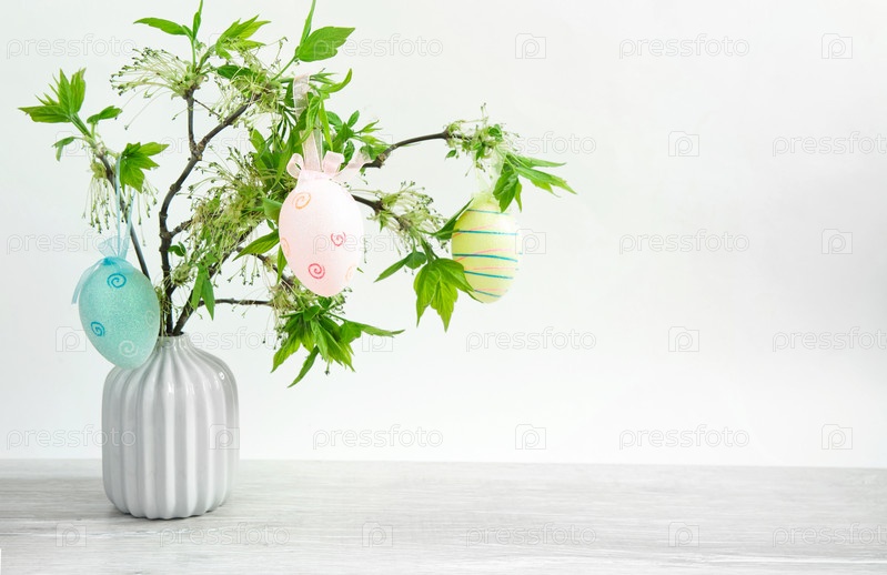 Букет зеленых веток с распустившимися свежими листьями в вазе на столе украшен разноцветными пасхальными яйцами. Декор в интерьере дома на Пасху. Копировать пространство