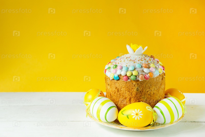 Пасхальный кулич с крашеными яйцами на блюде на белом столе. Традиционная праздничная еда. Желтый фон