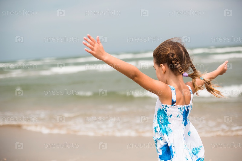 Портрет девушки на берегу моря. Ребенок наслаждается волнами, отдыхает на пляже, путешествует