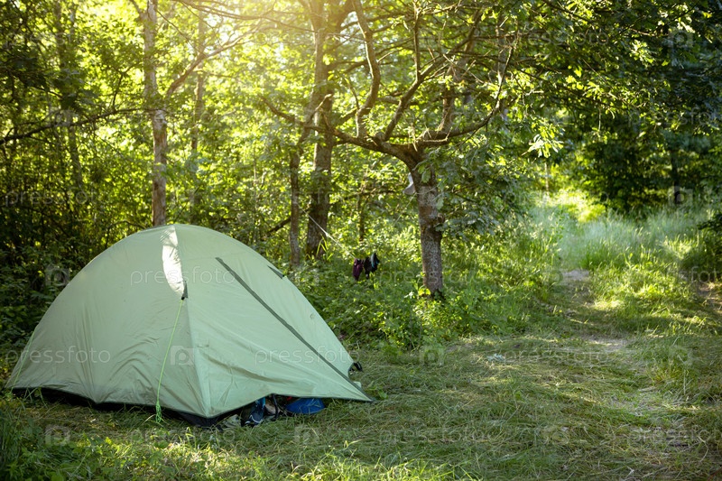Установлена туристическая палатка в кемпинге на природе в лесу. Внутренний туризм, активный летний отдых, семейные приключения. Экотуризм, спорт, походы. Скопируйте пространство, макет