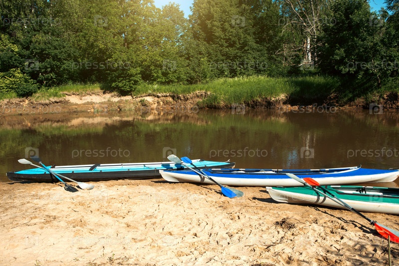 Туристические каноэ с веслами летом стоят на берегу реки во время водного похода. Сплав на надувных и каркасных двухместных и трехместных байдарках, семейный поход, экстремальные приключения летом