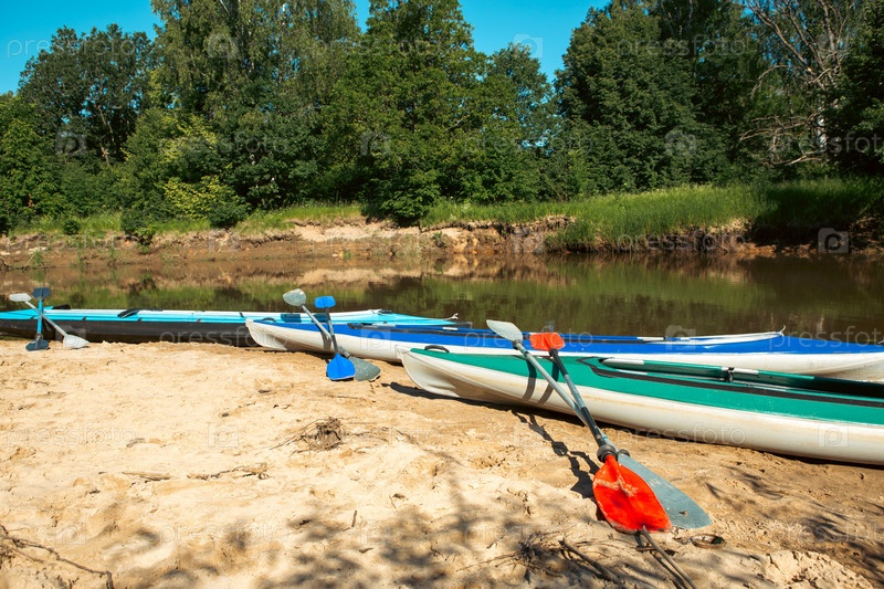 Туристические каноэ с веслами летом стоят на берегу реки во время водного похода. Сплав на надувных и каркасных двухместных и трехместных байдарках, семейный поход, экстремальные приключения летом