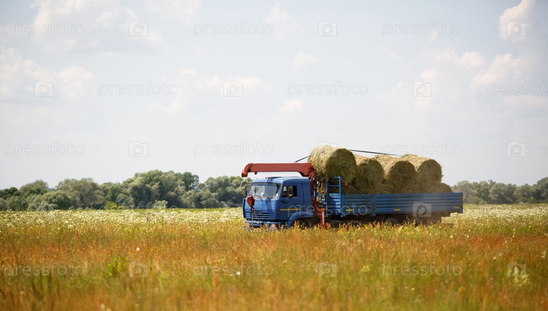 Синий грузовик со стрелкой вывозит с поля круглые стога сена. Заготовка на зиму для скота, сельское хозяйство, животноводство, уборка с полей