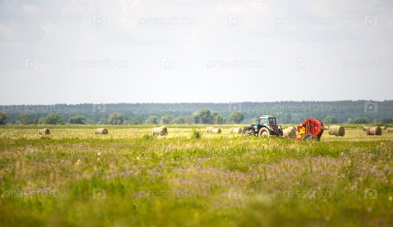Зеленое поле с белыми цветами летом. Трактор собирает траву в круглые стога на заднем плане. Уборка урожая, сельскохозяйственная техника, корма для скота, комбайновые работы