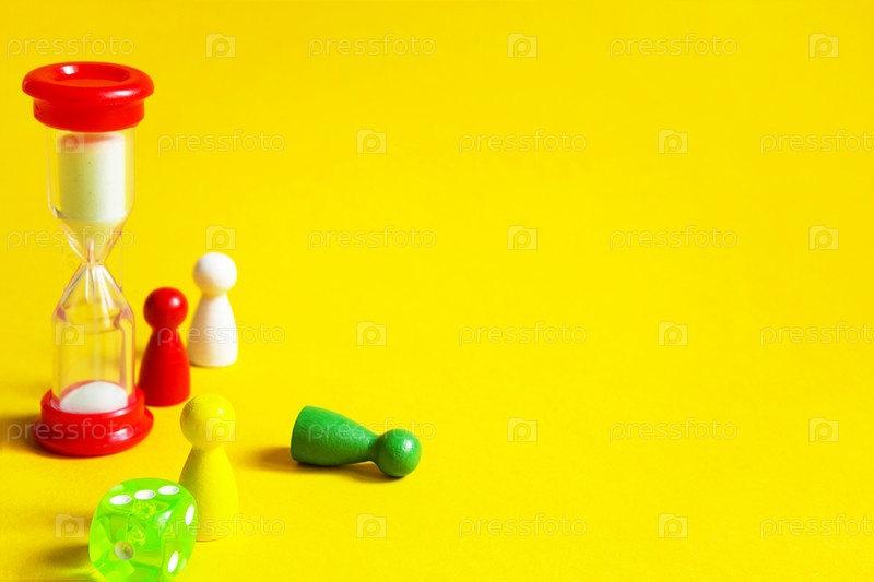 Макет настольных игр на желтом фоне: кости, фишки, таймер песочных часов. Развлечение дома для детей и взрослых. Копировать пространство