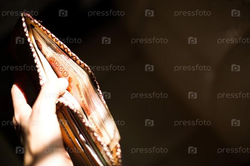 Кожаный бумажник, набитый русскими деньгами — купюрами 5000, пять тысяч рублей. Мужская рука держит открытый, переполненный кошелек на черном фоне в луче света. Копировать пространство