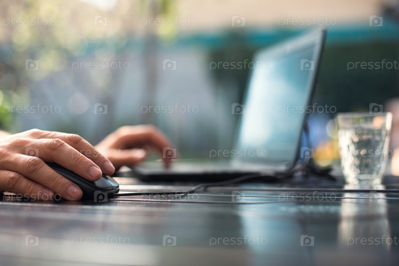 Работа за ноутбуком во дворе под открытым небом - мужские руки крупным планом. Домашний офис, удаленная работа, удаленное местоположение. Используя клавиатуру и мышь, расслабьтесь
