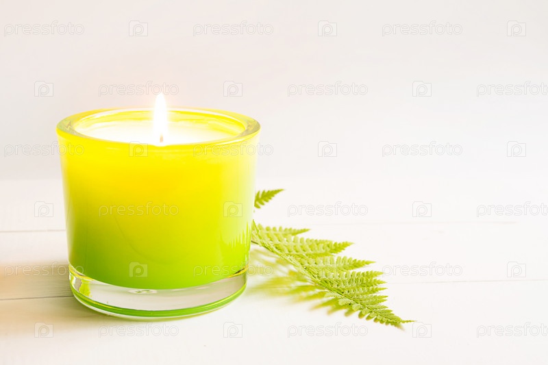 Пламя огня горит на зеленой ароматической свече с папоротником и натуральным ароматом на белом фоне. Ароматерапия, релаксация, уход за телом, гармония. Копировать пространство