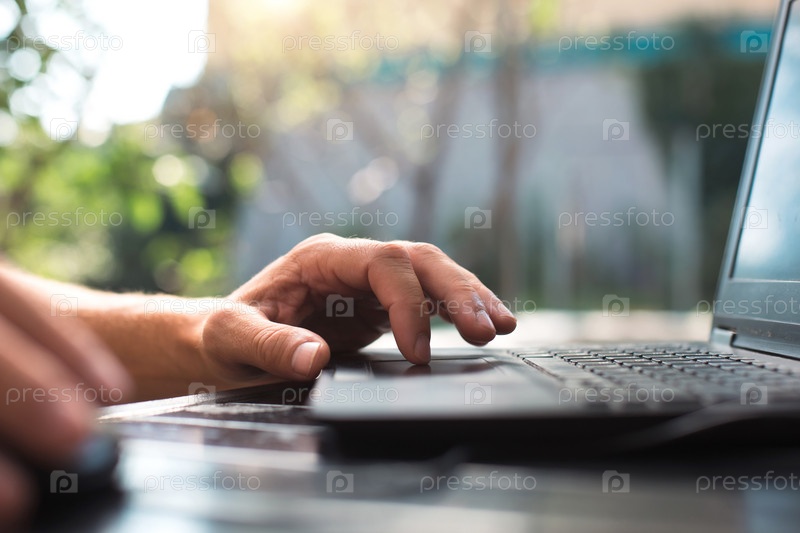 Работа за ноутбуком во дворе под открытым небом - мужские руки крупным планом. Домашний офис, удаленная работа, удаленное местоположение. Используя клавиатуру и мышь, расслабьтесь