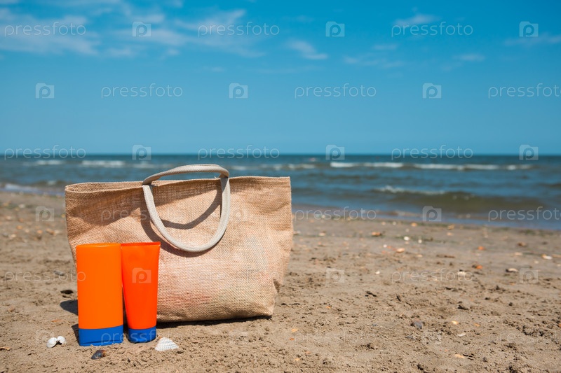 Оранжевый тюбик с солнцезащитным кремом, солнцезащитными очками и пляжной сумкой стоит на песке у моря и качается на ветру. Защита от ультрафиолета, пляжный отдых, путешествия