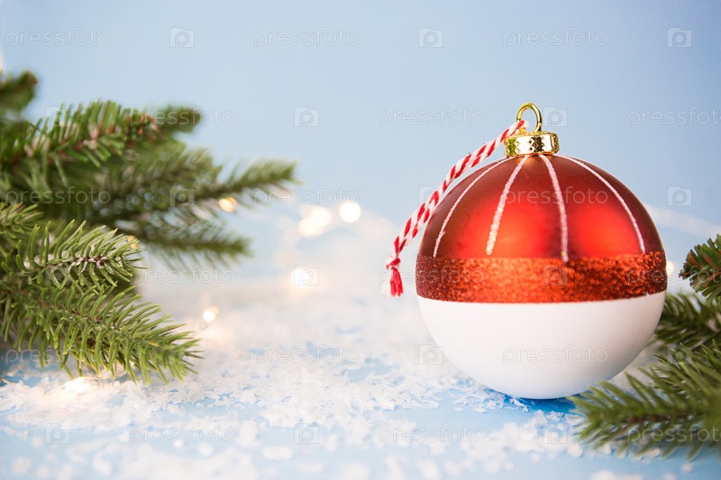 Красный елочный шар на синем фоне с искусственным снегом, ветвями ели и огнями гирлянд в боке. Праздничный фон, новый год. Копировать пространство