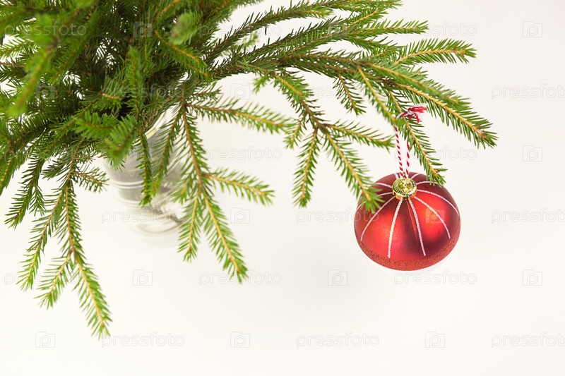 Красный Рождественский шар на живой еловой ветке в вазе на белом фоне. Новый год, Рождество, пространство для копирования