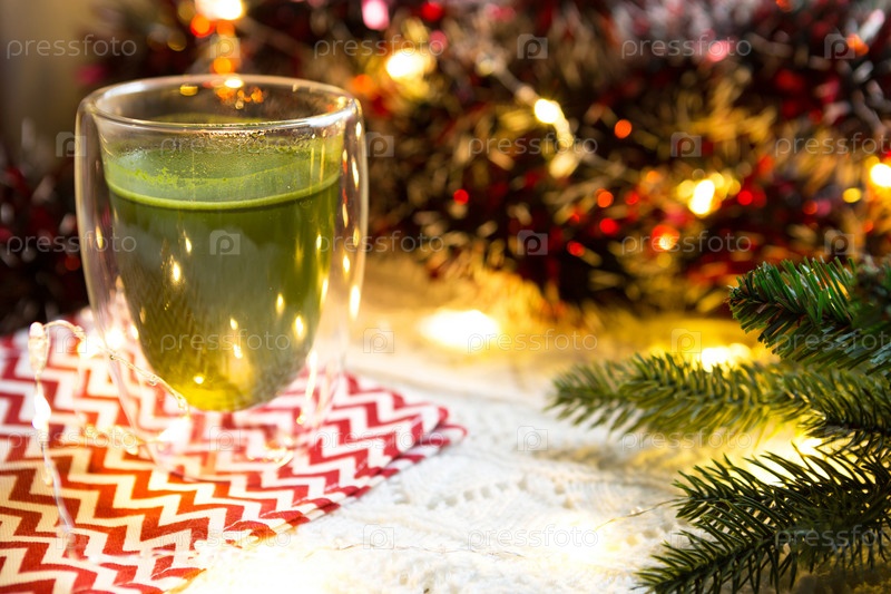 Прозрачный стеклянный стакан с двойными стенками и японским чаем маття на столе с рождественским декором. Новогодняя атмосфера, гирлянда и мишура, еловая ветка, уют, вязаный плед, шар, полосатая салфетка