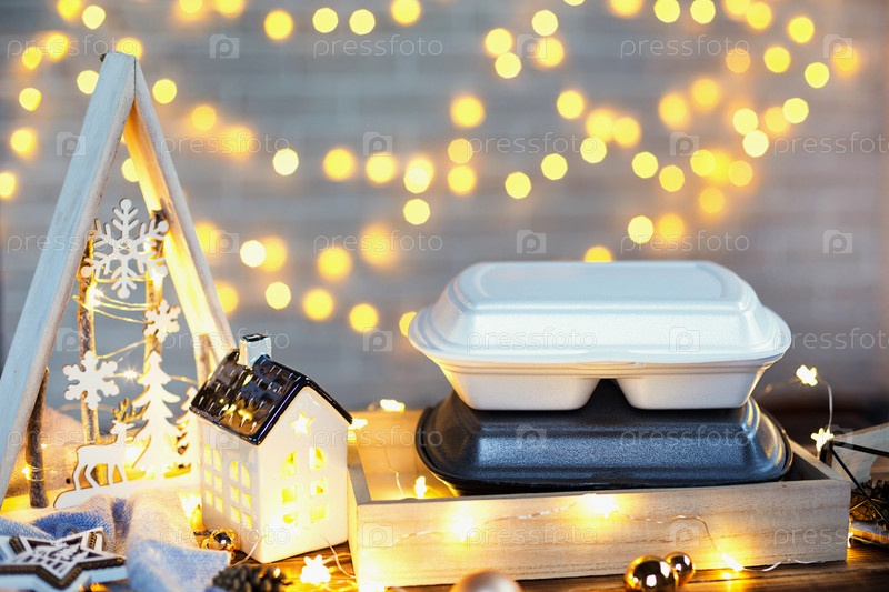 Рождественский декор контейнеров службы доставки еды. Предновогодняя акция. Готовый горячий заказ, одноразовая пластиковая коробка в сказочном свете. Работа по организации питания в праздничные дни. Скопируйте пространство, макет