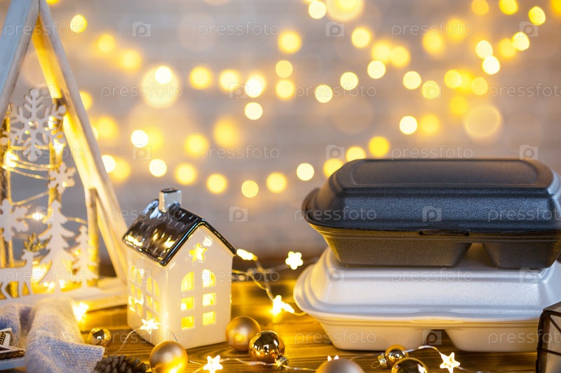 Рождественский декор контейнеров службы доставки еды. Предновогодняя акция. Готовый горячий заказ, одноразовая пластиковая коробка в сказочном свете. Работа по организации питания в праздничные дни. Скопируйте пространство, макет