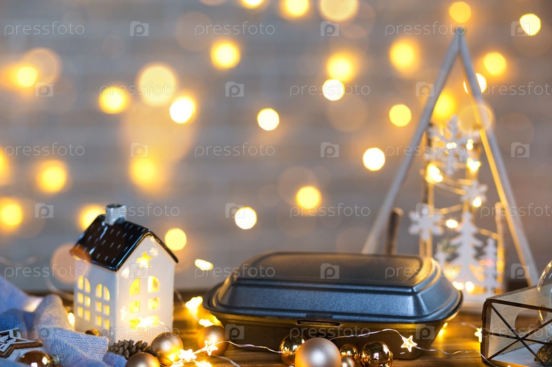 Рождественский декор контейнеров службы доставки еды. Предновогодняя акция. Готовый горячий заказ, одноразовая пластиковая коробка в сказочном свете. Работа по организации питания в праздничные дни. Скопируйте пространство, макет