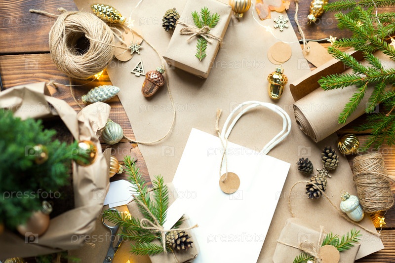 Подарочная упаковка к Рождеству и Новому году из экологически чистых материалов: крафт-бумага, живые еловые ветки, шишки, шпагат. Теги с макетом, натуральный декор, ручная работа, сделай сам. Скопируйте пространство. Плоско, фон