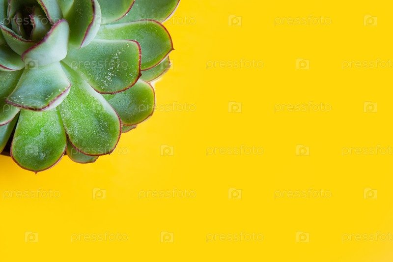 Эхеверия в горшке на желтом фоне. Комнатное растение, зеленый дом, суккулент – символ гармонии. Уход за комнатными растениями