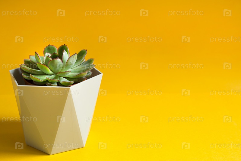 Эхеверия в горшке на желтом фоне. Комнатное растение, зеленый дом, суккулент – символ гармонии. Скопируйте пространство. Уход за комнатными растениями