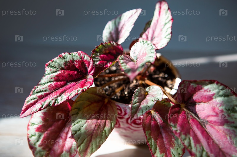 Бегония Мауи Закат декоративно-лиственный Рекс, алый лист крупным планом при ярком солнечном свете с тенями. Комнатные растения в горшках, домашний декор, уход и выращивание