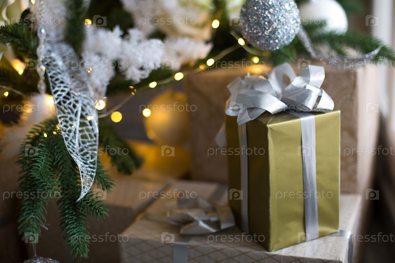 Подарочная коробка в золотой упаковке и серебряный бант под елку с белым декором. Новый год, Сочельник, поздравления для семьи, уют и ожидание чуда