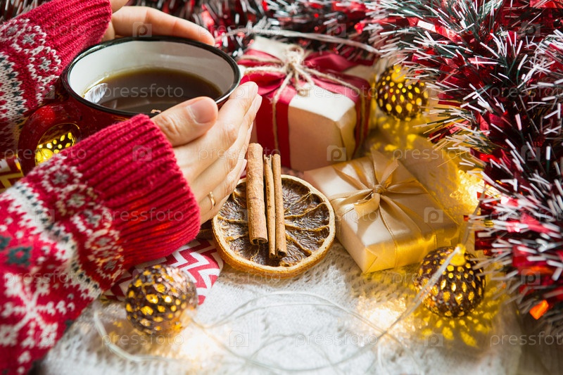 Женская рука в теплом свитере держит красную кружку с горячим напитком на столе с рождественскими украшениями. Новогодняя атмосфера, палочки корицы и долька сушеного апельсина, подарки, гирлянда и мишура