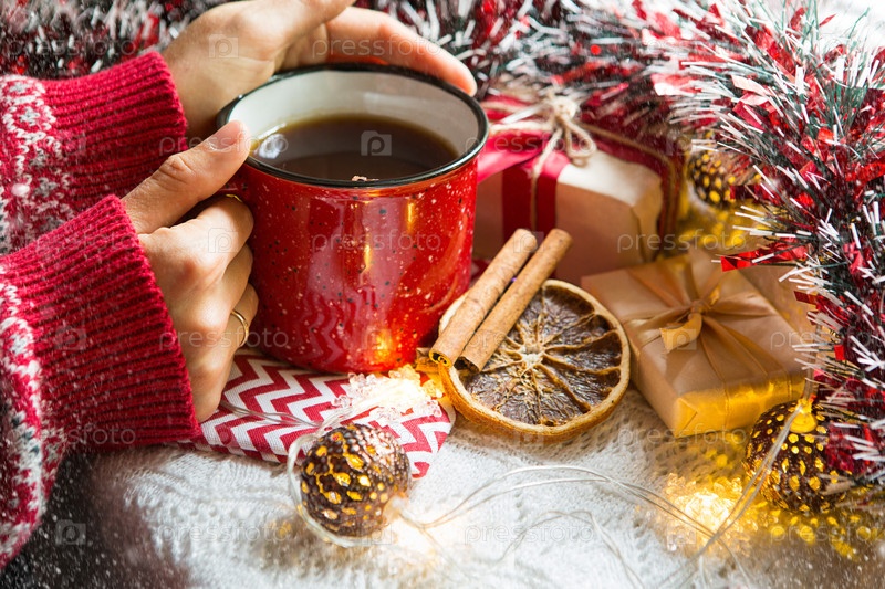 Женская рука в теплом свитере держит красную кружку с горячим напитком на столе с рождественскими украшениями. Новогодняя атмосфера, палочки корицы и долька сушеного апельсина, подарки, гирлянда и мишура