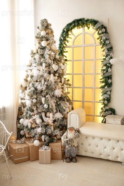 Рождественская зеленая искусственная елка в светлой комнате дома возле большого окна от пола до потолка с желтым светом. Украшен белыми шариками, шишками. Подарочные коробки из крафт-бумаги. Новый год