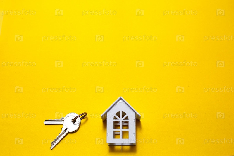 Символ белого деревянного дома и ключи на желтом фоне. Концепция строительства коттеджа, планировка и дизайн, архитектурный план, переезд в новый дом, риелторское агентство. Место для текста, ровно