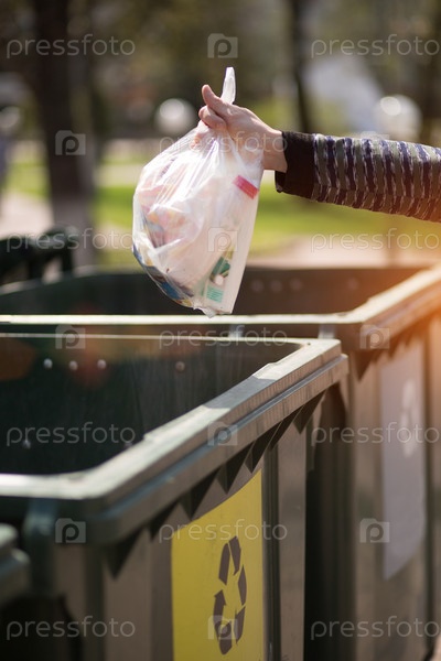 Рука с мешком пластикового мусора над контейнерами для разделения и сортировки в России со словами: стекло, пластик, бытовые отходы
