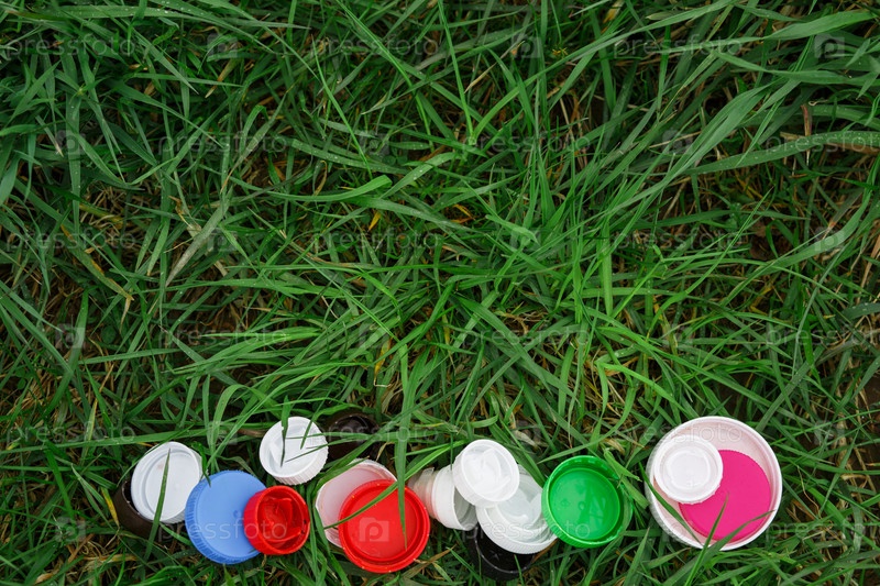 Красочные крышки пластиковых бутылок на зеленой траве. Волонтерская благотворительная акция