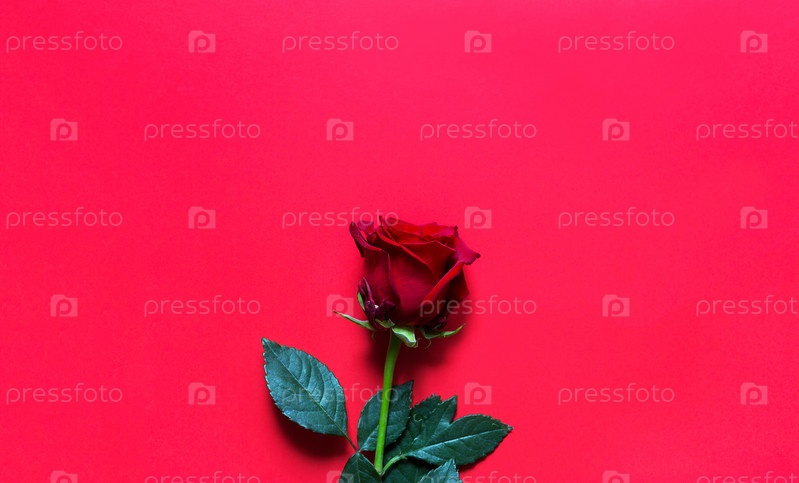Красная роза на красном фоне с копирайтом. Подарок женщине на праздник, приглашение на свидание, День святого Валентина, знак любви