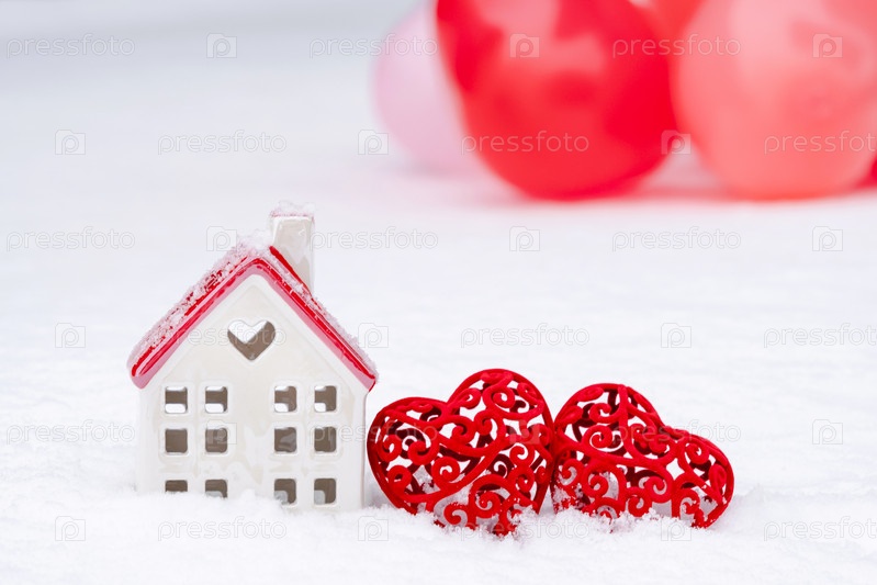 дом и два сердца в снегу. День святого Валентина, любовь в доме. Пара жилья, недвижимость, аренда, ипотека, переезд. Уют и тепло в любовном гнездышке