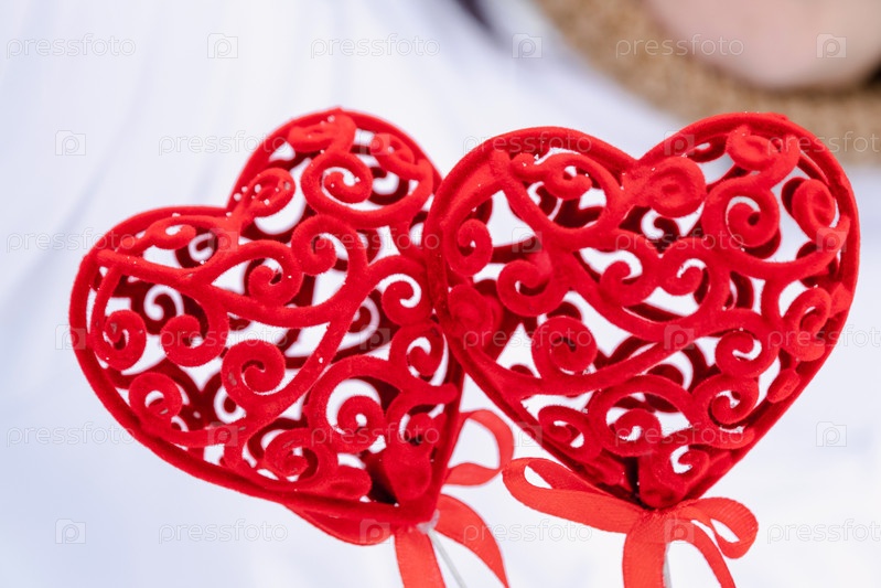 Два красных сердца в руках - поздравительная открытка на День святого Валентина, праздник всех влюбленных 14 февраля. Скопируйте пространство. Приглашение на свидание, любовь, знакомства, валентинка