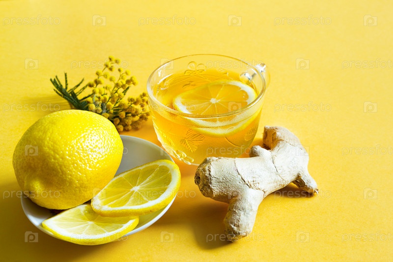 Лекарственный чай в чашке, имбирь, лимон, акациевый – укрепляют иммунитет, в холодное время года – напрочь. Витаминный напиток для здоровья и ингредиенты на желтом фоне