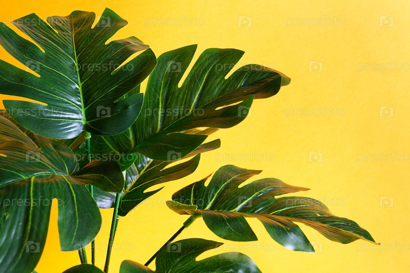 Крупный план листьев монстеры на желтом фоне. Искусственное комнатное растение, декор и уют для дома. Резной тропический лист. Копировать пространство